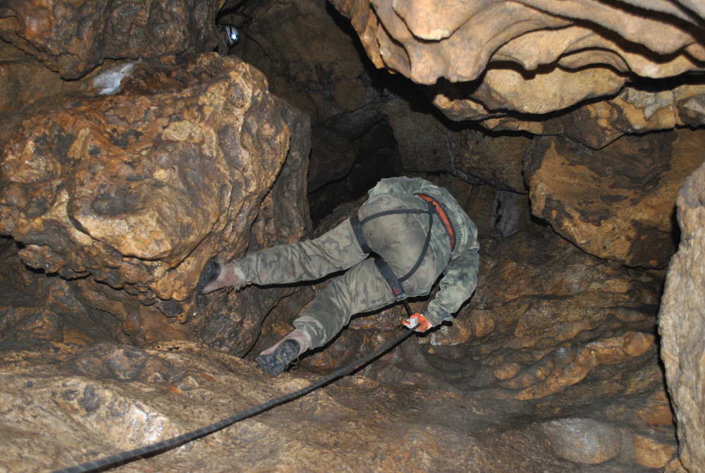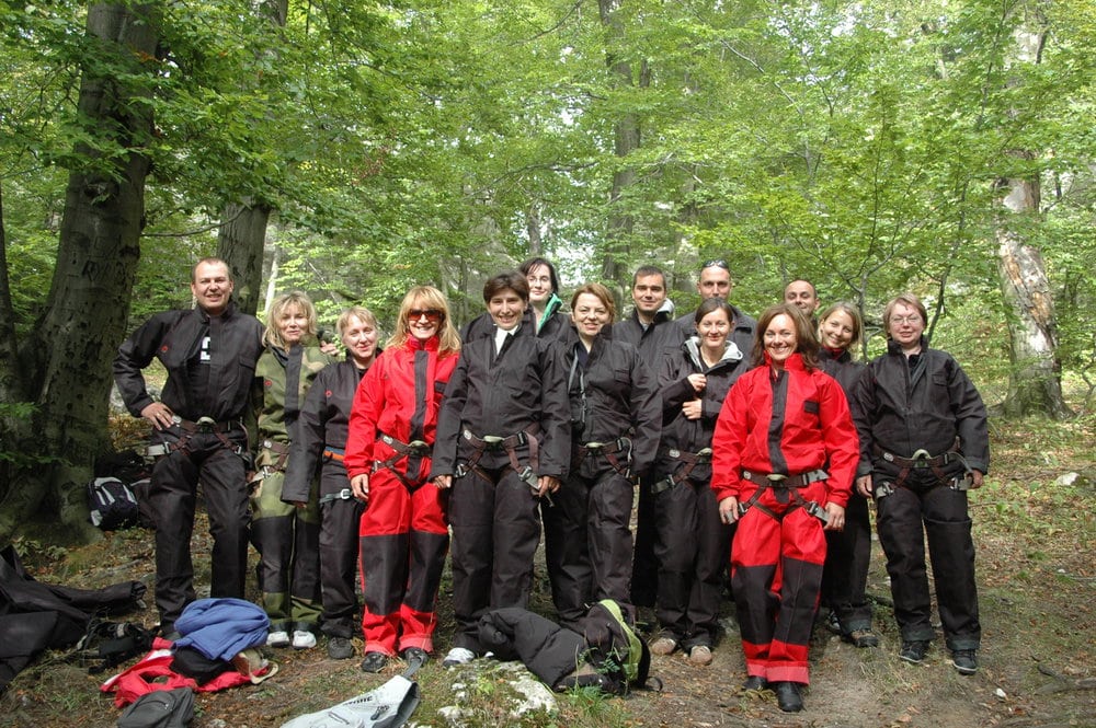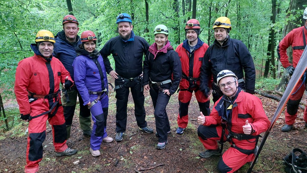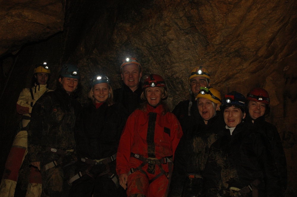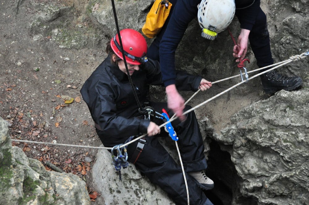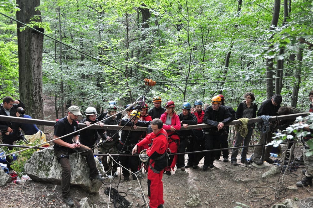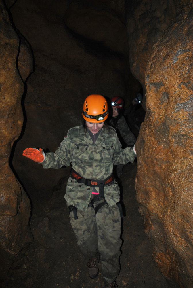 Wyprawa pod ziemię. Proponujemy je małym grupom do 20os. Na przygotowanie się do zjazdu, zwiedzanie a następnie wyjście z jaskini 10 osobowa grupa potrzebuje około 3/4 godzin. Dlatego proponujemy podzielenie się na dwa mniejsze zespoły. Jeden udaje się do jaskini a drugi na manewry linowe lub inna aktywność. Spotkanie i wymiana grup następuje podczas obiadu polowego.