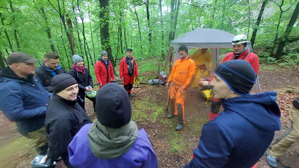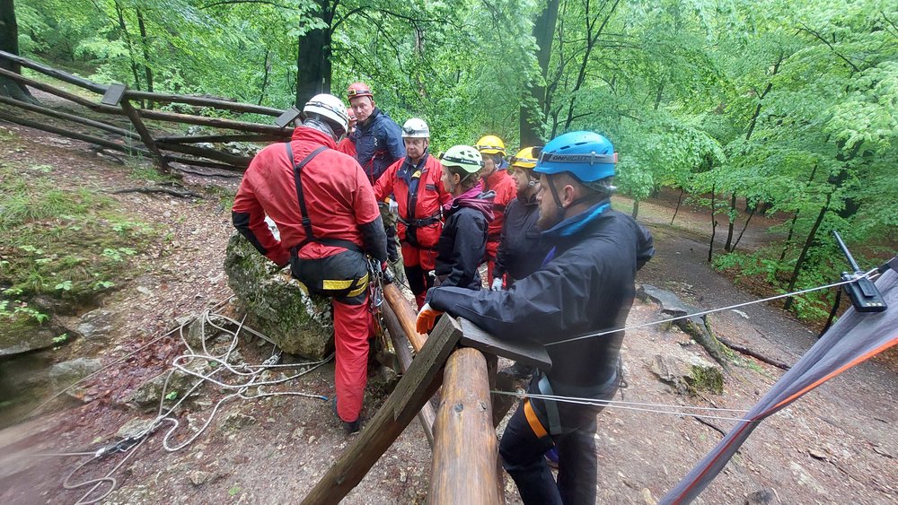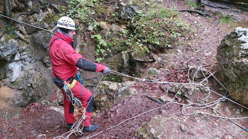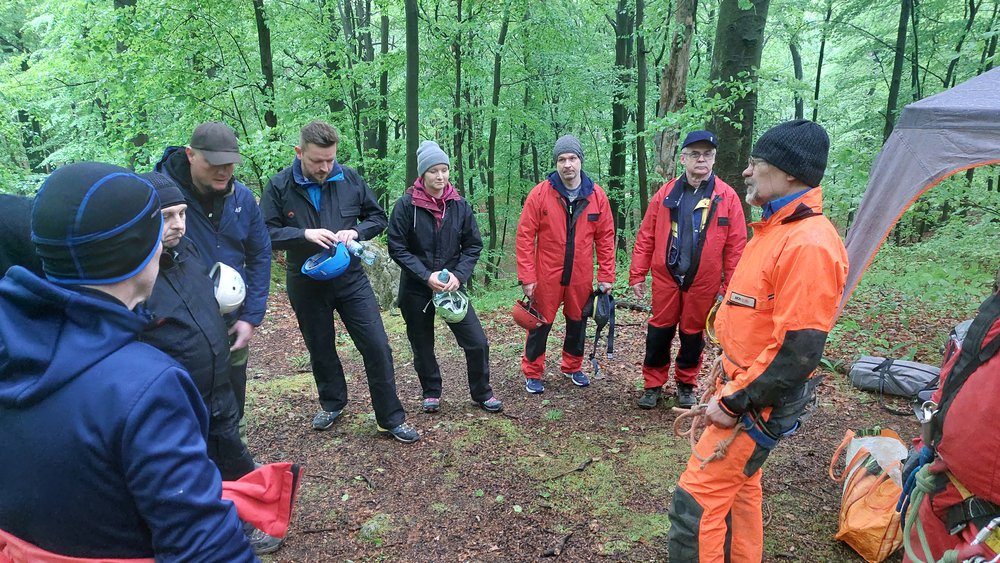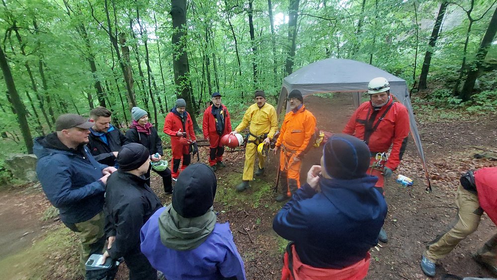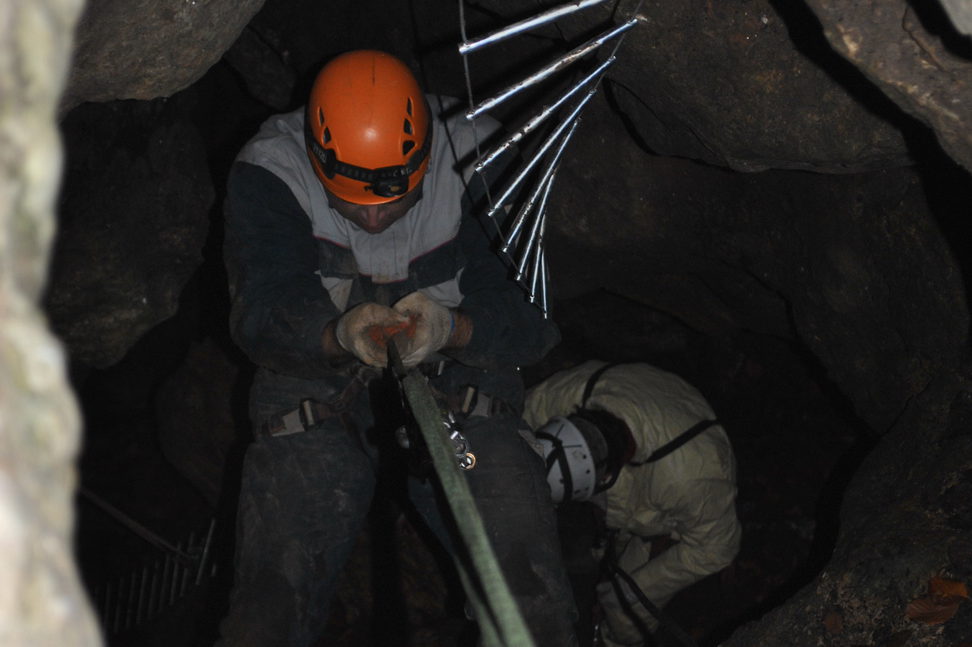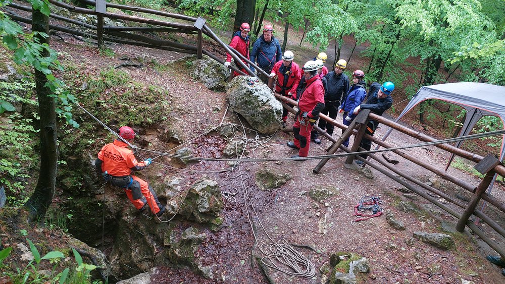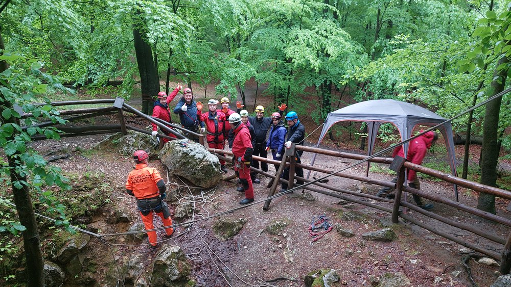 Wyprawa pod ziemię. Proponujemy je małym grupom do 20os. Na przygotowanie się do zjazdu, zwiedzanie a następnie wyjście z jaskini 10 osobowa grupa potrzebuje około 3/4 godzin. Dlatego proponujemy podzielenie się na dwa mniejsze zespoły. Jeden udaje się do jaskini a drugi na manewry linowe lub inna aktywność. Spotkanie i wymiana grup następuje podczas obiadu polowego.